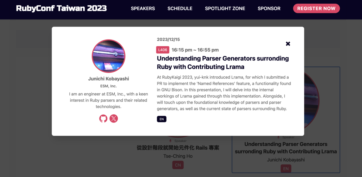 2023年12月15日(金) から16日(土) の2日間にわたって台湾の台北で開催される RubyConf Taiwan 2023 に、永和システムマネジメントから @junk0612 が登壇します。